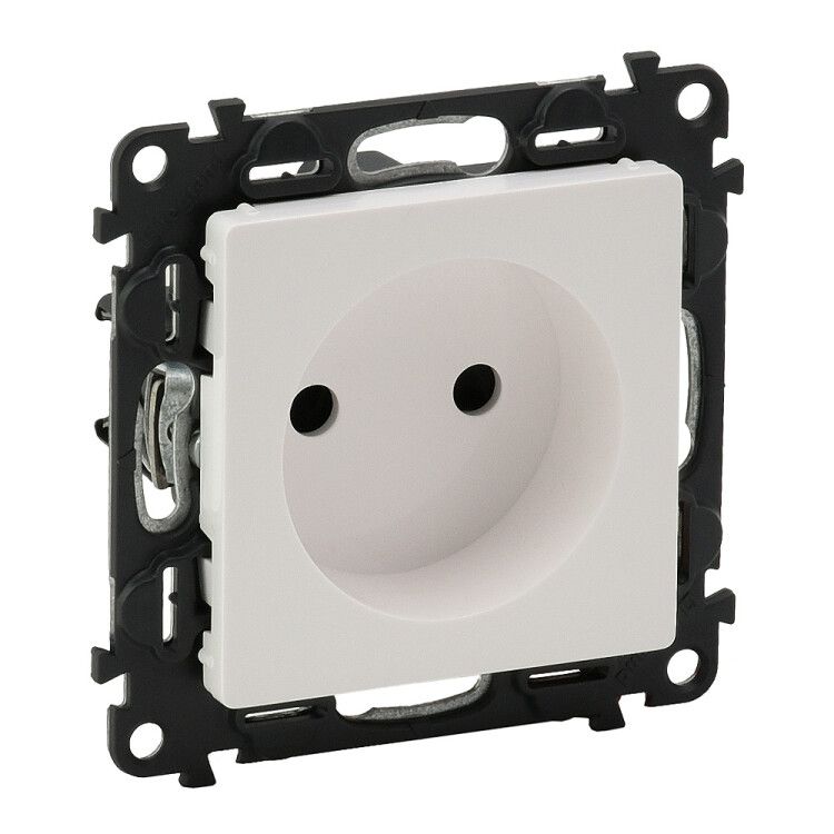 Розетка силовая 1-местная 16А 250В с защитными шторками, безвинтовые зажимы, белая, с лицевой панелью совместима со стандартными монтажными коробками глубиной от 40 мм. Устанавливается в стационарные ниши под штукатурку - не требует внешней рамки. Безвинтовые зажимы позволяют быстро и надежно зафиксировать провода сечением до 2,5 мм2 без инструментов: достаточно вставить провод до щелчка. Для правильного монтажа важно соблюдать полярность: L-провод подключается к соответствующему контакту, N - к противоположному. Нулевой и заземляющий провода не используются - розетка не имеет третьего контакта.