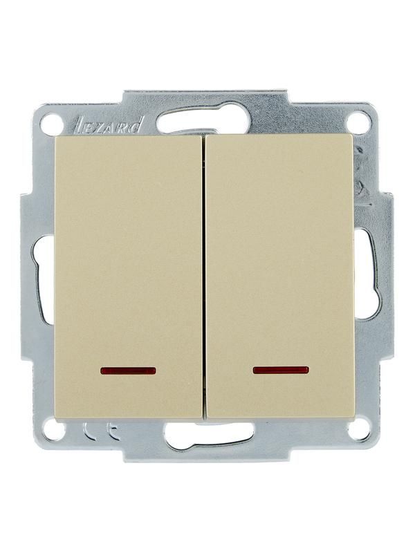 Выключатель двухклавишный с индикацией механизм титан LEZARD СП - это надёжное устройство для управления двумя группами освещения с подсветкой положения клавиш, подходящее для жилых и общественных помещений. Артикул 742-3788-112 принадлежит к серии VESNA бренда LEZARD.