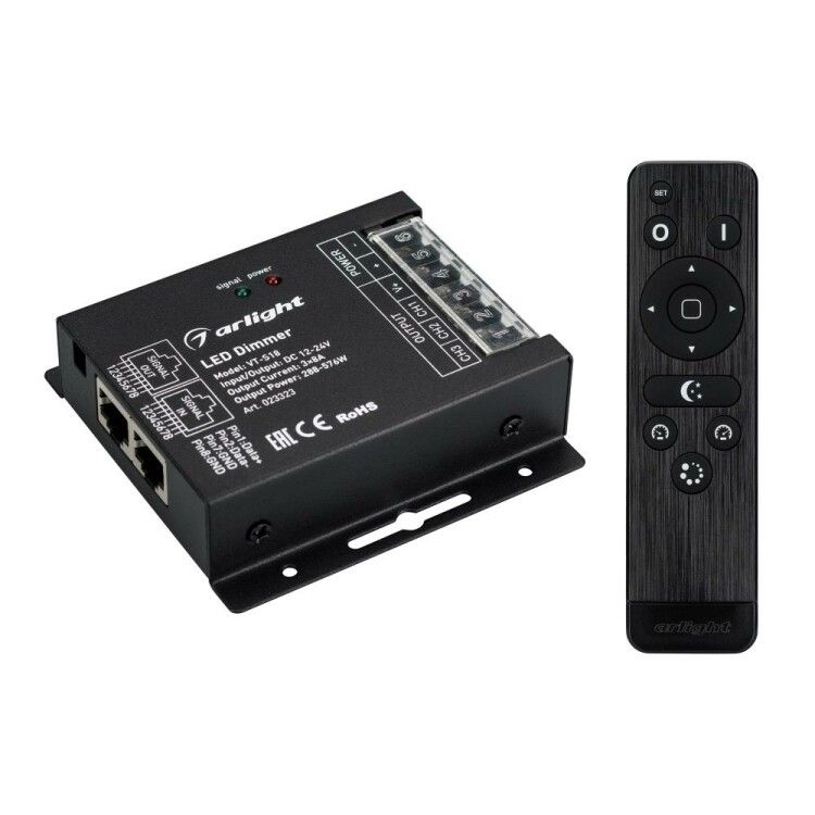 Диммер VT-S18-3x8A от Arlight - это трёхканальное устройство для регулировки яркости светодиодных лент на напряжении 12–24 В постоянного тока. Управление осуществляется через радиопульт Стик с 12 кнопками, что удобно для удалённого контроля освещения без проводов. Артикул 023323 подходит для установки в помещениях с невысокими требованиями к защите от пыли и влаги.