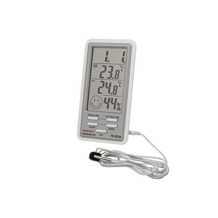 Комнaтно-уличная метеостанция REXANT etm70-0518 позволяет одновременно отслеживать температуру и влажность внутри помещения и за его пределами. Устройство сочетает точные датчики, память для записи экстремальных значений и базовые бытовые функции - часы, будильник и календарь.