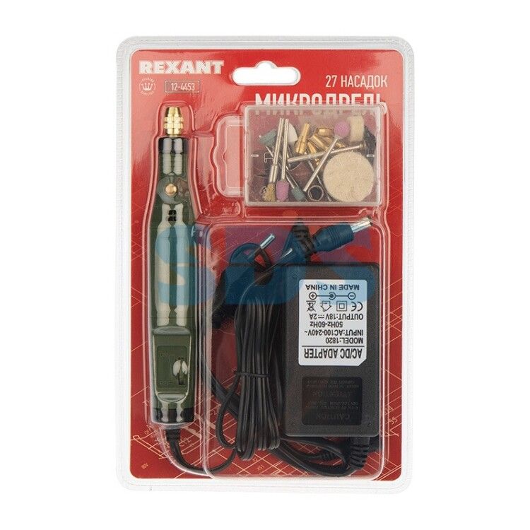 Микро-дрель (гравер) Rexant 12-4453 не требует сложного монтажа. Устройство подключается через комплектный адаптер 18 В к бытовой сети 230 В. Для установки насадок используйте латунный зажимной патрон - он совместим со всеми входящими в комплект элементами.