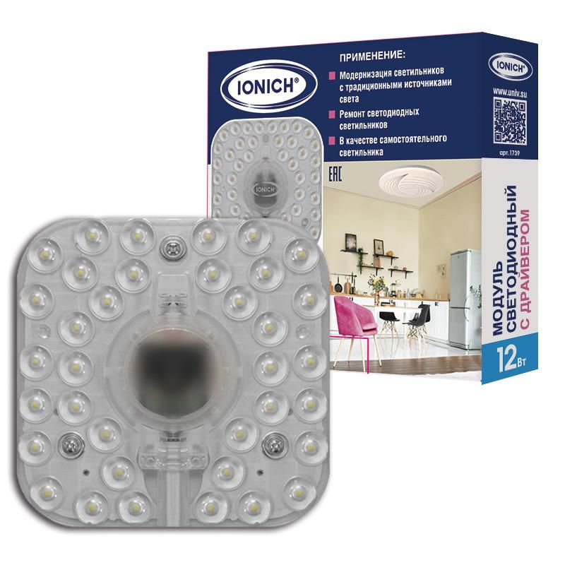 Модуль светодиодный 12 ватт 6500 кельвин IP20 960 люмен 230 вольт 98х98 миллиметр для декоративных светильников от бренда IONICH - компактный источник света с высокой яркостью и холодным белым цветом, предназначенный для встраивания в настольные, настенные и потолочные декоративные светильники. Артикул 1739 обеспечивает простую замену старых ламп без необходимости доработки цепи.