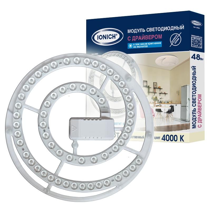 Модуль светодиодный высокой мощности 48Вт 4800лм 230В 4000К d260х25мм IP20 от бренда IONICH - компактный источник света для профессионального освещения, рассчитанный на работу напрямую от сети 230 В. Подходит для установки в светильники промышленного и коммерческого типа, где важна яркость и надежность.