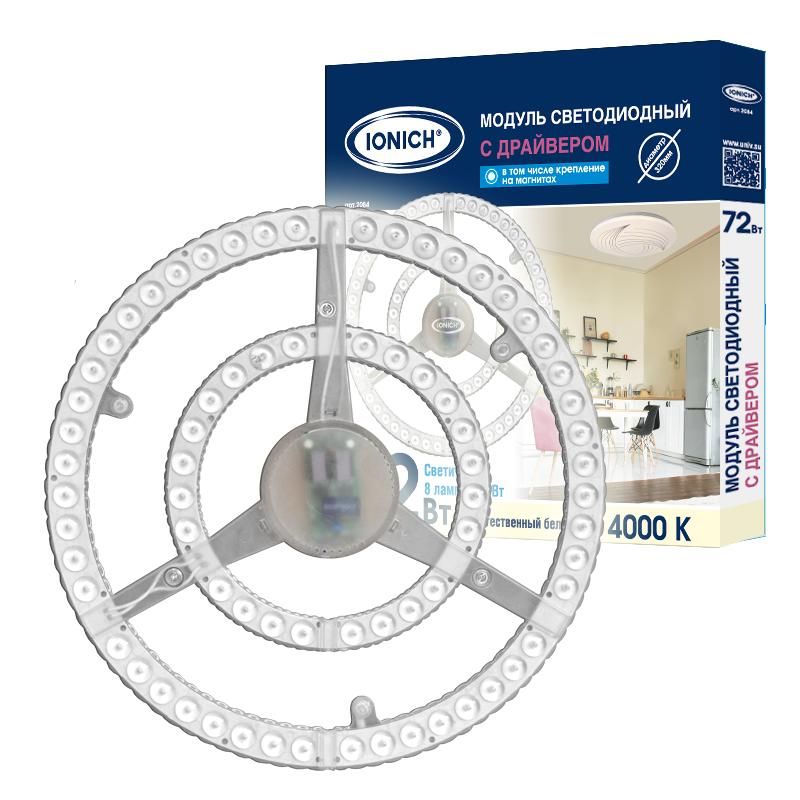 Модуль светодиодный высокой мощности 72Вт 7000лм 230В 4000К d320х25мм IP20 от бренда IONICH - компактный источник света для замены традиционных ламп в промышленных и коммерческих осветительных системах. Артикул 2084 рассчитан на работу напрямую от сети 230 В, что упрощает установку без внешних драйверов.