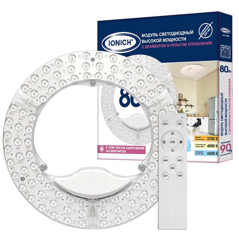 Модуль светодиодный высокой мощности с пультом дистанционного управления для декоративных светильников 80 Вт 230 В 3000-6500 К диаметр 320 мм диммируемый IP20 от бренда IONICH - это готовое решение для создания равномерного и настраиваемого освещения в интерьерах. Артикул 2088 предназначен для установки в потолочные светильники, где важна точная регулировка яркости и цветовой температуры.