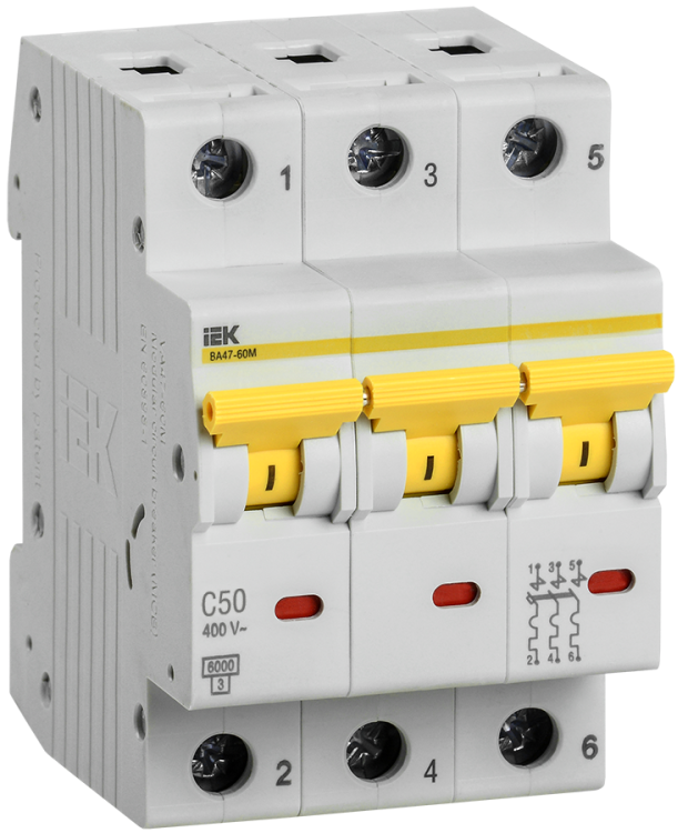 Автоматический выключатель ВА47-60 от IEK - трёхполюсное устройство на 50 А с отключающей способностью 6 кА, предназначенное для защиты электропроводки от перегрузок и коротких замыканий. Подходит для установки в квартирных, этажных и распределительных щитах жилых и административных зданий.