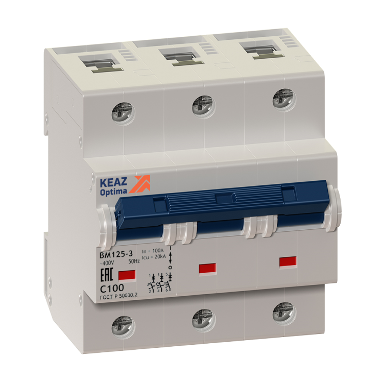 Выключатель автоматический трехполюсный OptiDin BM125 100А C 20кА (BM125-3C100-8ln-УХЛ3) | 138545 КЭАЗ