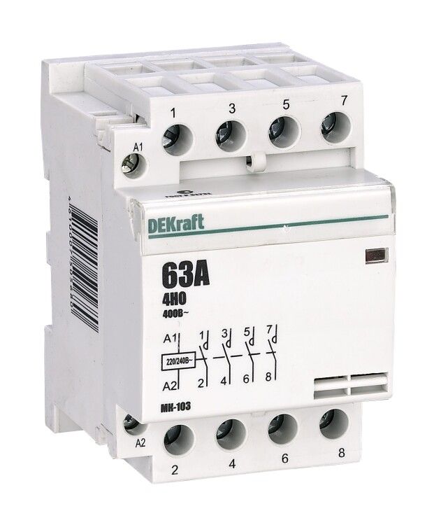 Контактор модульный МК-103 от DEKraft - устройство для дистанционного включения и отключения электрических нагрузок с частыми циклами работы. Артикул 18074dek подходит для монтажа на DIN-рейку и управление нагрузками до 32 А в бытовых и промышленных системах.