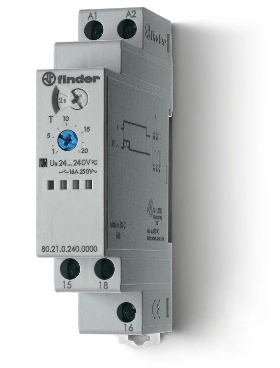 Модульный таймер 1-функциональный (DI); питание 24…240В АС/DC; 1CO 16A; ширина 17.5мм; регулировка времени 0.1с…24ч; степень защиты IP20 FINDER 802102400000 80.21.0.240.0000