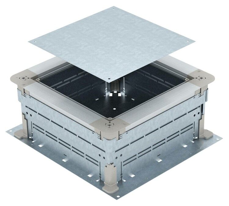Основание OBO BETTERMANN UZD250-3 устанавливается перед заливкой бетонной стяжки. Его можно закрепить на арматуре или опорах, выставив нужную высоту в диапазоне 165–220 мм. После застывания бетона верхнюю часть легко демонтируют - открывается доступ к каналу для протяжки кабелей. Уплотнения (например, резиновые кольца) устанавливаются на вход/выход канала для герметизации. Минимальная толщина стяжки должна составлять не менее 165 мм - ниже этого значения основание не будет полностью закрыто бетоном, что снижает механическую устойчивость.