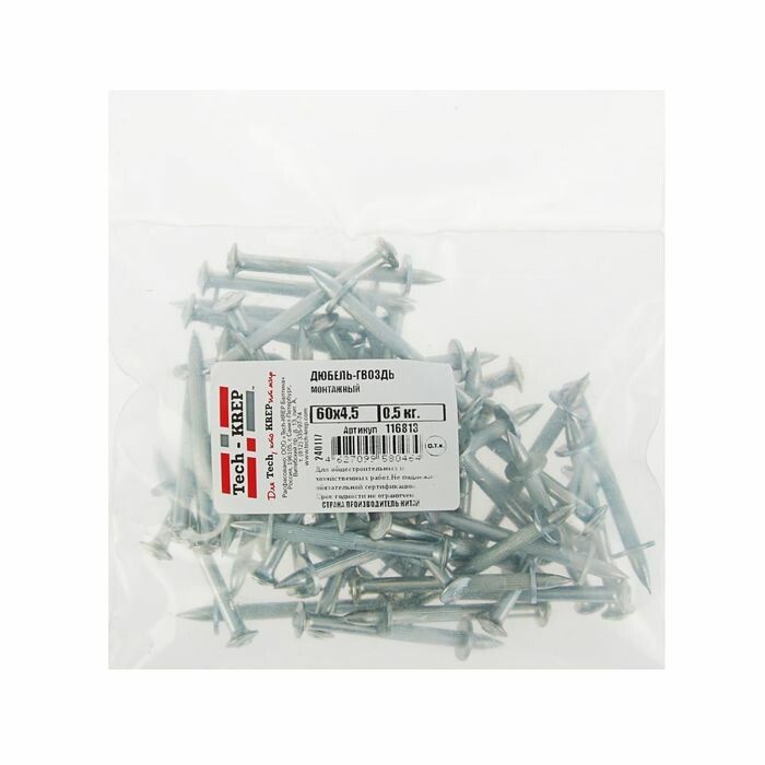 Монтажный дюбель-гвоздь 4,5х60 (0,5 кг) - пакет | 116813 Tech-KREP - это удобный и надежный инструмент для сквозного монтажа металлических и деревянных строительных конструкций. Он изготовлен из углеродистой стали с антикоррозионным цинковым покрытием, что обеспечивает долгий срок службы.