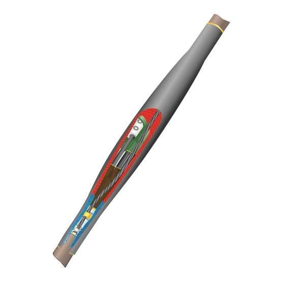 Болтовые соединители уже установлены внутри муфты - они служат для механического и электрического контакта между жилами. После сборки и прогрева полимерная оболочка плотно обтягивает кабель, обеспечивая герметичность.