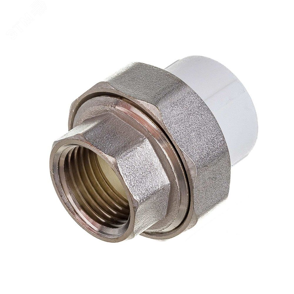 Муфта усиленная комбинированная разъемная (американка) с внутренней резьбой 20х1/2 дюйм белая совместима с трубами ППР диаметром 20 мм и металлическими трубами с наружной резьбой 1/2 дюйм. Для монтажа: