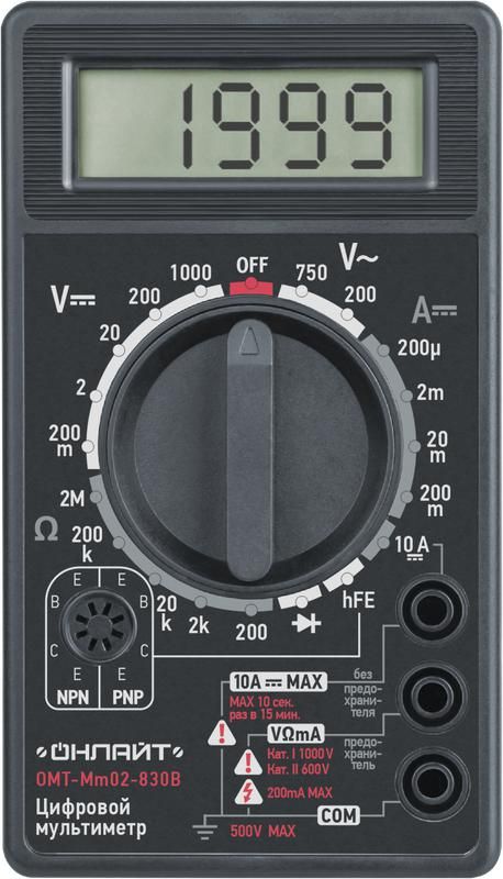 Мультиметр цифровой OMT-мм02-830B (830B) - надёжный инструмент для точных измерений напряжения, тока и сопротивления в бытовых и промышленных сетях. Бренд ОНЛАЙТ и артикул 830B указывают на серию OMT-MM, предназначенную для профессионального электромонтажа и диагностики оборудования.