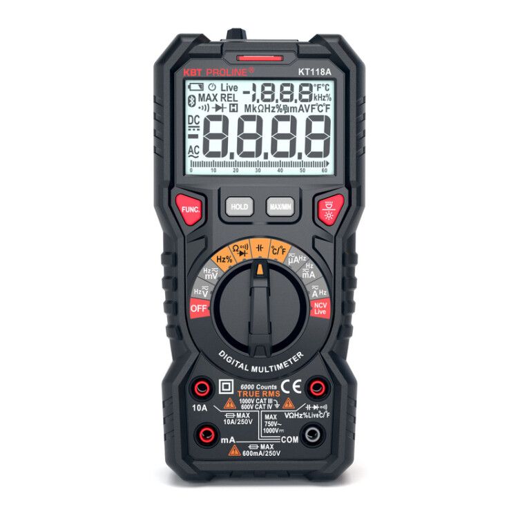 Мультиметр цифровой KT 118A серия PROLINE - надёжный многофункциональный прибор для точных измерений напряжения, тока, сопротивления, температуры и частоты в условиях промышленного обслуживания и аварийного ремонта. Бренд КВТ предлагает эту модель как часть линейки PROLINE, ориентированную на профессиональное применение с поддержкой True RMS и автоматического выбора диапазонов.