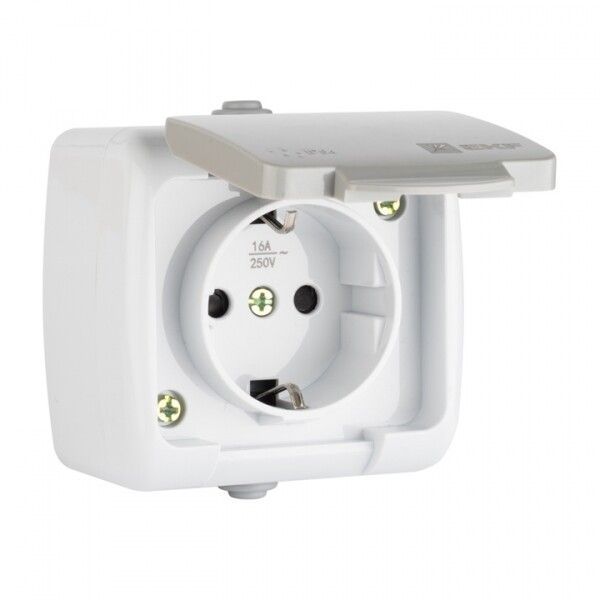 Розетка 1-местная 16А с заземлением, защитными шторками, крышкой, IP54, серая от бренда EKF из серии Мурманск PROxima предназначена для надёжного подключения оборудования в условиях повышенной влажности, запылённости и открытой проводки - например, в гаражах, подсобках, на террасах под навесом.