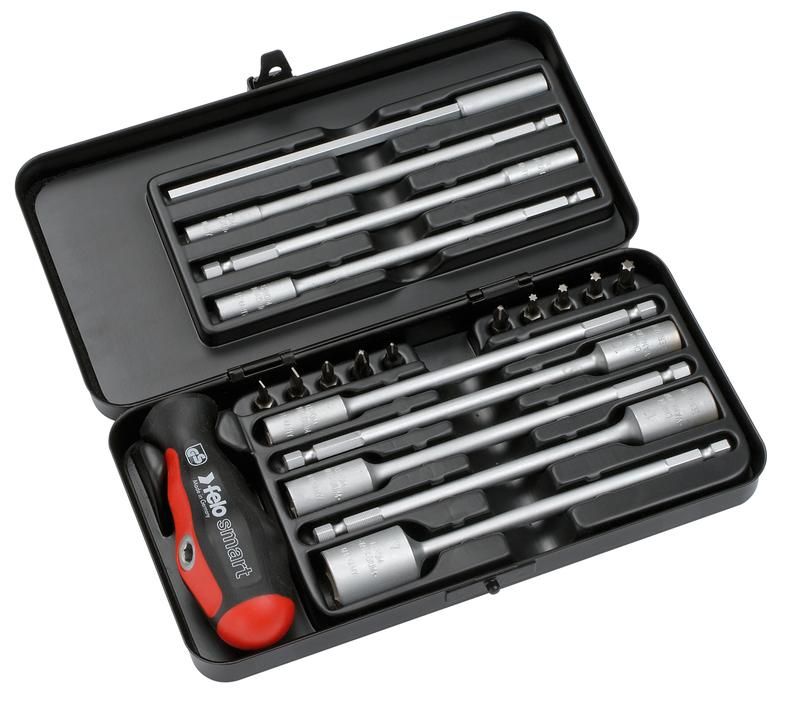 Набор бит SL/PH/Tx/PZ и дюймовых/метрических головок с рукояткой SMART в кейсе, 20 шт от Felo - компактный универсальный инструмент для точной работы с крепежом в условиях ограниченного доступа. Набор сочетает биты и головки с рукояткой SMART, что делает его удобным как для домашнего ремонта, так и для профессионального сервиса.