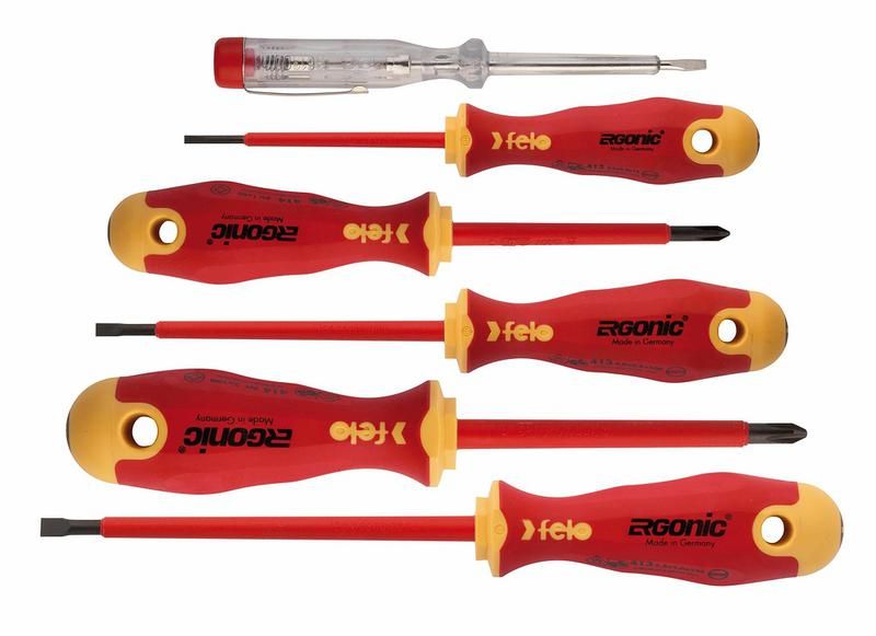 Набор диэлектрических отверток FELO ERGONIC 41396398 - комплект из шести инструментов с изолированными рукоятками и пробником напряжения, предназначен для безопасной работы под напряжением до 250 В. Подходит для электромонтажа, обслуживания оборудования и ремонта бытовых устройств.