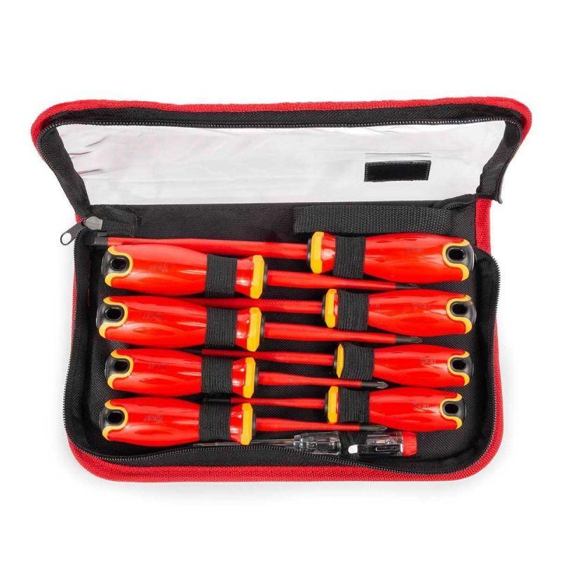Набор диэлектрических отверток НИО-2209 серия СЛИМ от бренда КВТ - компактный и надёжный инструмент для работы под напряжением до 1000 В. Подходит для электромонтеров, обслуживающих распределительные щиты, оборудование и автоматические системы. Все отвертки в наборе имеют усиленную изоляцию, а индикаторная отвертка позволяет проверить наличие напряжения без дополнительного оборудования.