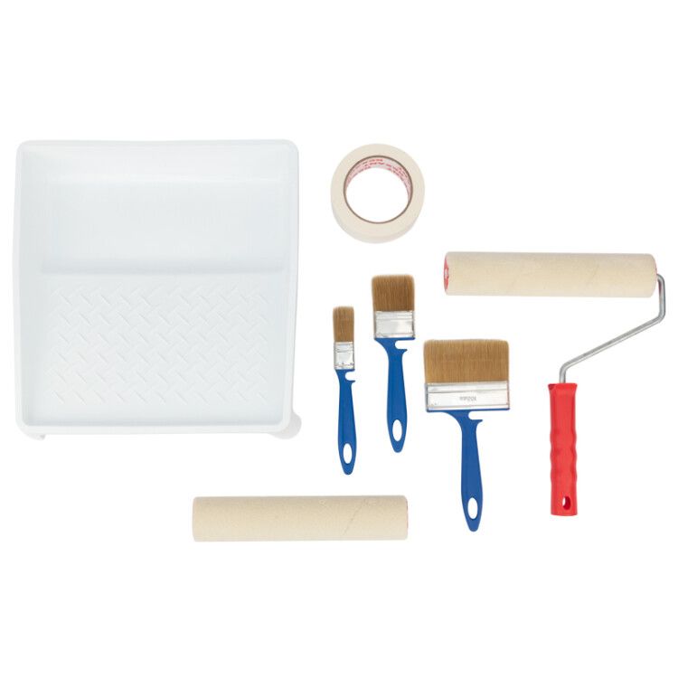 кюветка малярная, кисть плоская Лаки 25х10, кисть плоская Лаки 50х12, кисть плоская Лаки 100х12, валик 240 мм, сменный ролик для валика 240 мм, малярный скотч, упаковка