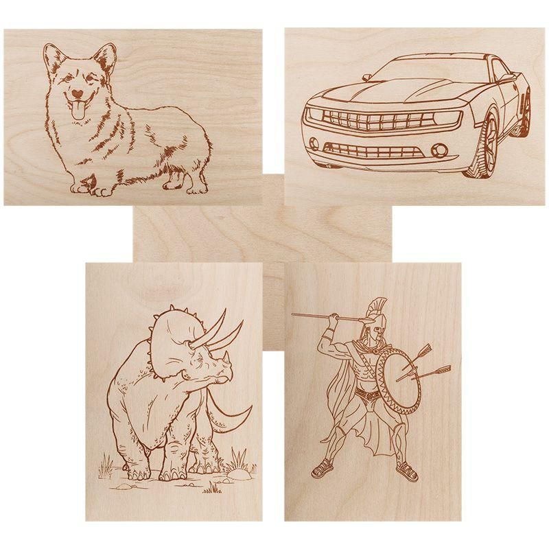 Доски для выжигания набор №2 формат А5 (воин/динозавр/собака/машина/без рисунка) 5 шт. предназначены для выполнения художественного выжигания - создания рисунков путём обжига древесины нагретым жалом паяльника. Подходят для домашнего использования, школьных мастерских, детских центров и творческих студий. Четыре доски имеют предварительно нанесённые контурные рисунки, одна - пустая, что позволяет тренироваться как по шаблону, так и самостоятельно.