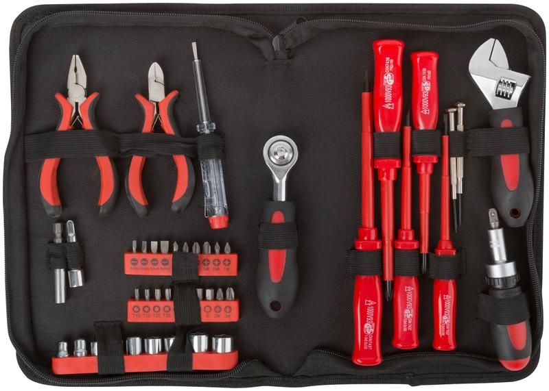 Набор инструмента электрика (сумка) - 65140 FIT - это незаменимый помощник для проведения ремонтных работ под напряжением. В наборе содержится 45 предметов, включая отвертки, вороток, ключ разводной, адаптер для головок, удлинители, пассатижи, бокорезы, 9 торцевых головок и биты.