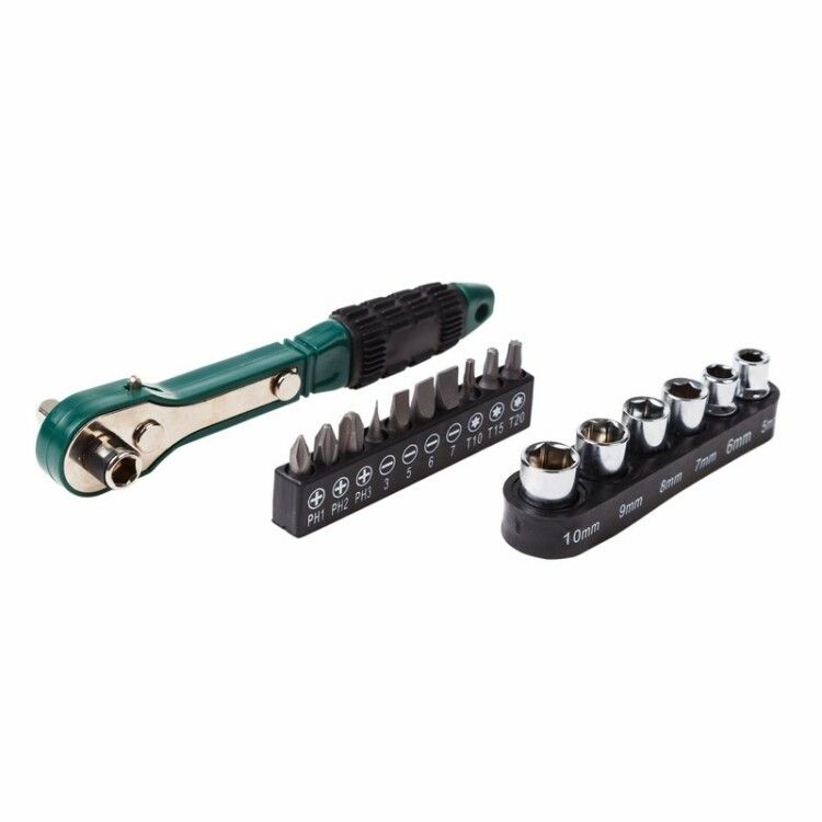 - Количество элементов: 17 шт. - 6 головок + 10 бит + 1 ключ-трещотка