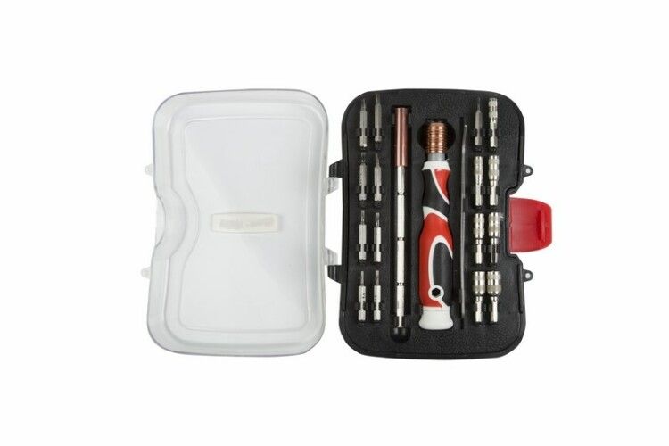 - Общее количество элементов: 19 (включая отвертку, биты, пинцет и удлинитель)