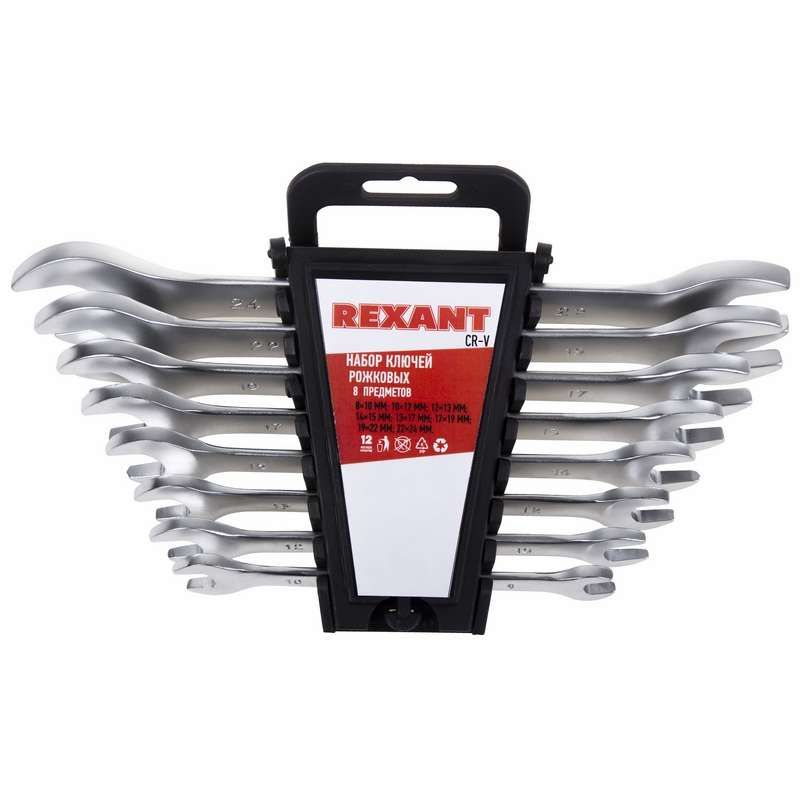 Набор ключей рожковых (8–24 мм), 8 шт., CrV, зеркальное хромирование от REXANT - комплект надёжных инструментов для затяжки и ослабления резьбовых соединений в условиях повышенной нагрузки. Ключи выполнены из хромованадиевой стали с антикоррозийным покрытием, что делает их подходящими как для домашнего ремонта, так и для профессионального использования на производстве.