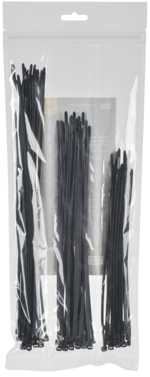 Набор хомутов 3,6х200; 3,6х250; 3,6х300 черный (75 штук в упаковке) от IEK - комплект из 75 пластиковых хомутов трёх размеров для надёжного фиксирования кабелей и проводов в электромонтажных работах. Каждый хомут выполнен из прочного полиамида, устойчив к УФ-излучению и работает в широком температурном диапазоне.