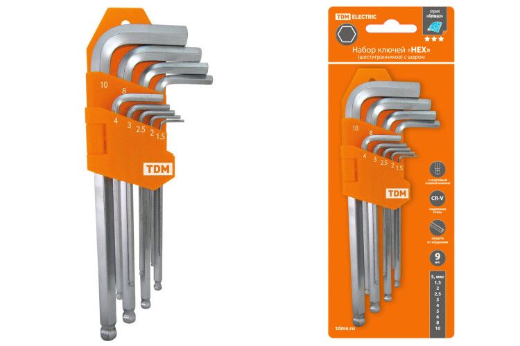 Набор ключей шестигранных 9 штук: 1.5-10 мм, длинные с шаром, держатель в блистере, сталь CR-V от TDM ELECTRIC (артикул sq1020-0104) предназначен для точного монтажа и демонтажа крепежа с шестигранниками в условиях ограниченного доступа. Компактная комплектация с удобным держателем делает его надежным инструментом для электротехнических работ, бытовой техники и автосервиса.