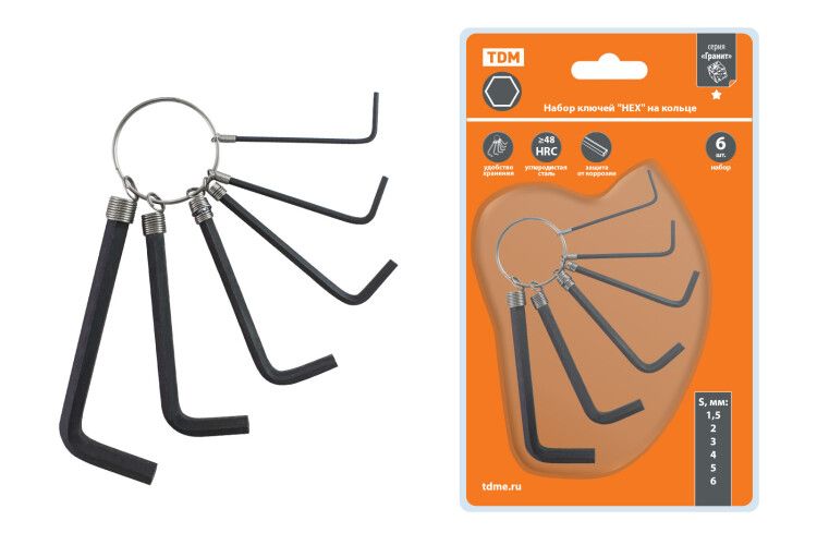 Набор ключей "HEX" на кольце 6 шт.: 1.5 - мм, углеродистая сталь, блистер "Гранит" TDМ | SQ1020-0201 TDM ELECTRIC - это незаменимый инструмент для монтажа и демонтажа шестигранного и TORX крепежа. Он идеально подходит для сборки мебели, механосборочных работ в автомастерских и на производстве, а также для ремонта бытовой техники.