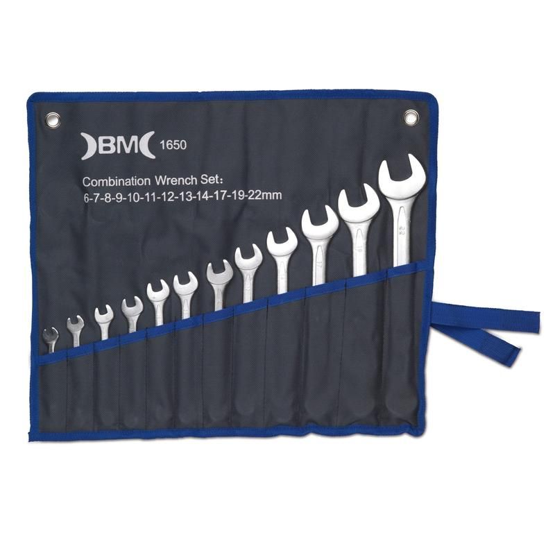 Набор комбинированных ключей 12 предметов от BM Group - компактный и надёжный инструмент для работы с гайками и болтами в условиях ремонта, сборки и обслуживания оборудования. Артикул bm-1650 содержит все основные размеры от 6 до 22 мм, что делает его универсальным решением для мастерских и полевых задач.