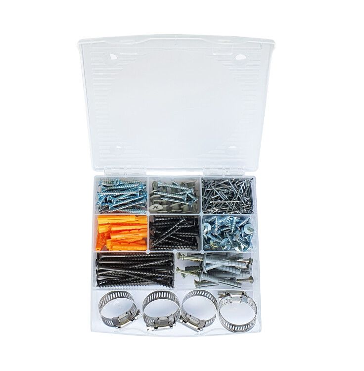 Дюбель-гвозди SM-G 6,0х40 мм (10 шт.), саморезы гипсокартон-дерево 4,2х75 мм (30 шт.), саморезы металл-металл 4,2х16 мм (60 шт.), саморезы гипсокартон-дерево 3,5х45 мм (30 шт.), саморезы универсальные оцинкованные 4,5х35 мм (10 шт.), саморезы универсальные оцинкованные 4,5х40 мм (35 шт.), дюбели распорные ZUM 6,0х37 мм (20 шт.), нейлоновые дюбели DRIVA PA 14,0х32 (10 шт.), хомуты обжимные 20-32 мм (4 шт.), гвозди финишные 1,6х30 мм (100 г)