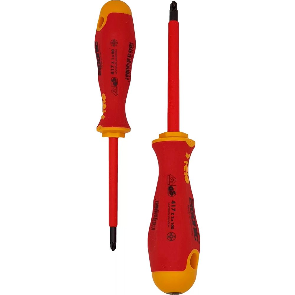 Набор крестовых диэлектрических отверток Ergonic 2 шт от бренда Felo (артикул 41792191) - компактный набор из двух изолированных отверток, предназначенный для безопасной работы с электрооборудованием под напряжением. Подходит для монтажа, обслуживания и ремонта электротехнических устройств в бытовых и профессиональных условиях.