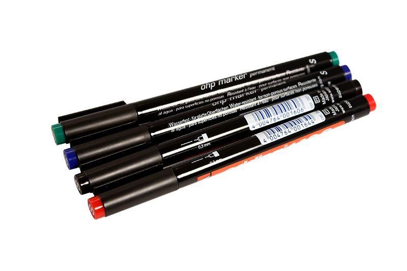 Маркер перманентный 0.3 мм для пленок и ПВХ набор: черный, красный, зеленый, синий совместим с любыми гладкими поверхностями: пластик, ПВХ, стекло, металл, эмаль, кабельная изоляция. Не требует специальных условий монтажа - достаточно провести им по поверхности легким движением. Наконечник не давит на материал, поэтому не оставляет вмятин или трещин даже на тонких пленках. Применяйте сразу после вскрытия - никакой подготовки не требуется.