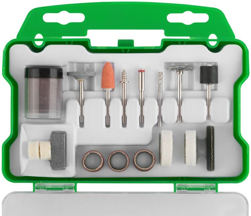 Предметы в наборе позволяют производить резку, шлифовку, зачистку и полировку изделий из различных материалов|Возможность точной обработки достигается за счет компактного размера насадок|Оптимальны для работы в труднодоступных местах