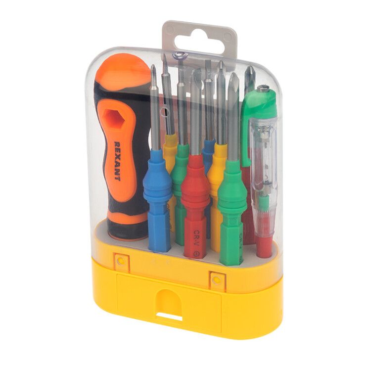 Набор отверток REXANT 10 в 1 предназначен для работы с резьбовыми соединениями: шурупами, саморезами, болтами и другими крепежными элементами. Подходит для монтажа и демонтажа оборудования в быту, на производстве, в автосервисе и при обслуживании электроники. Встроенный тестер-пробник позволяет проверять наличие напряжения в проводах, предохранителях и светильниках без дополнительных приборов.