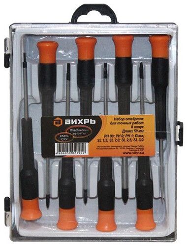 Набор отверток для точных работ НОТ 8 от бренда ВИХРЬ - комплект из eight высокоточных отверток с намагниченными наконечниками и изолированными рукоятками, предназначенный для работы с мелкими электронными компонентами, часами и другими чувствительными устройствами.