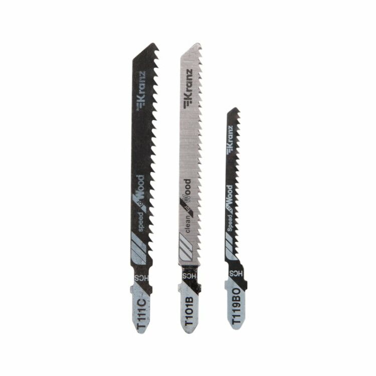 Набор полотен для электролобзика № 1 T101B/T111C/T119BO (3 шт./уп.) от бренда Kranz - компактный набор из трёх универсальных пилок для точной резки дерева, пластика и оргстекла. Подходит для столярных, ремонтных и отделочных работ, где важны чистый рез и совместимость с большинством электролобзиков.