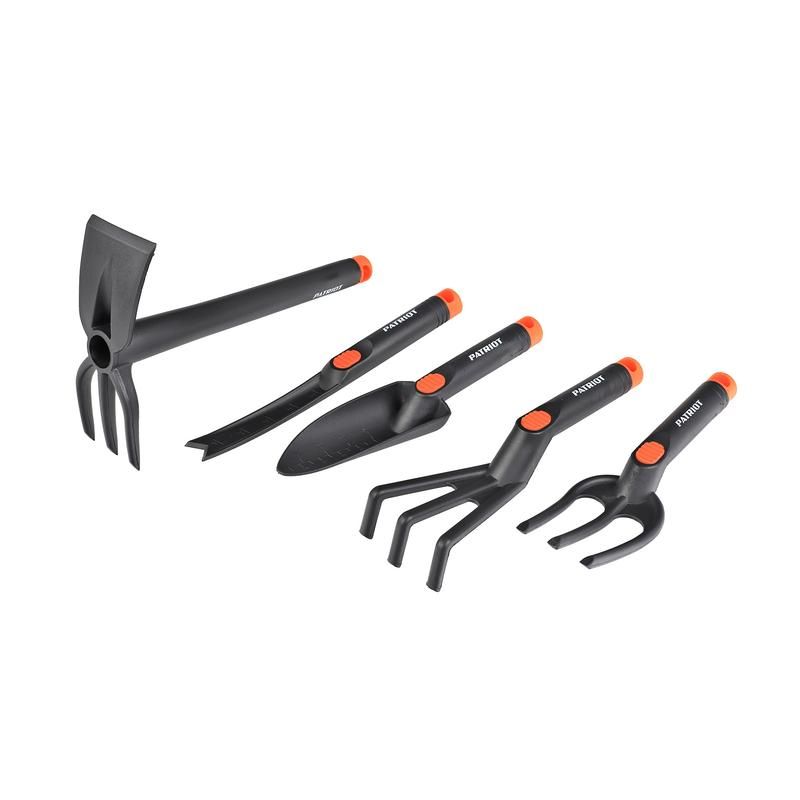 Набор садовых инструментов 5 предметов нейлон от Patriot (артикул 777001506) - компактный набор для ежедневного ухода за участком: посадки, прополки, рыхления и удаления сорняков. Все инструменты выполнены из прочного нейлона, что делает их легкими, долговечными и устойчивыми к влаге и коррозии.