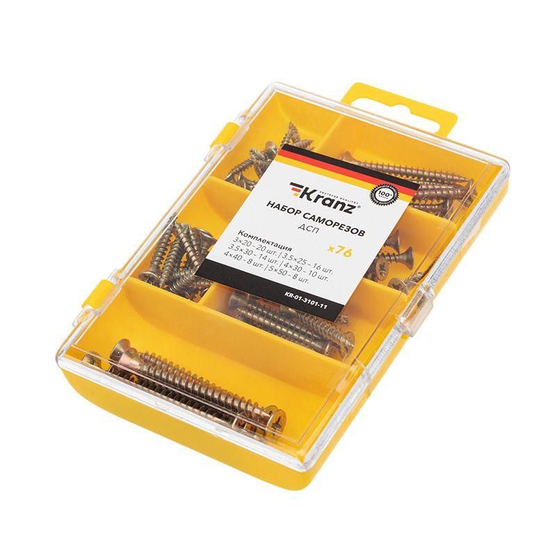 Набор саморезов для древесно-стружечных плит (ДСП) 76 шт. от Kranz (артикул kr-01-3101-11) предназначен для быстрого крепления материалов без предварительного сверления - идеально подходит для сборки мебели, отделочных работ и монтажа на деревянные основания.