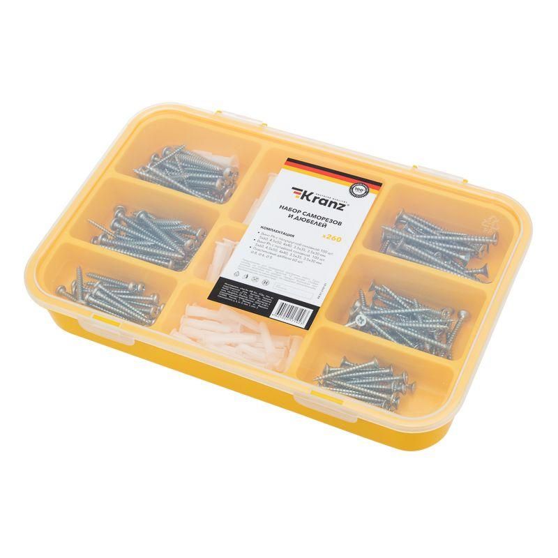 Набор саморезов и дюбелей 260 шт. от Kranz (арт. kr-01-3101-01) - универсальный комплект для надежного крепления к различным основаниям: дереву, бетону, кирпичу. Подходит как для бытовых ремонтов, так и для профессиональных задач на объектах.