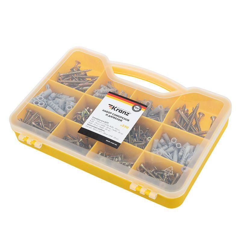 Набор саморезов и дюбелей 590 шт. от Kranz (артикул kr-01-3101-03) - готовый комплект крепежа для надежного соединения материалов на жестких основаниях: бетоне, кирпиче, ЖБИ. Подходит как для профессионального монтажа, так и для домашних работ.