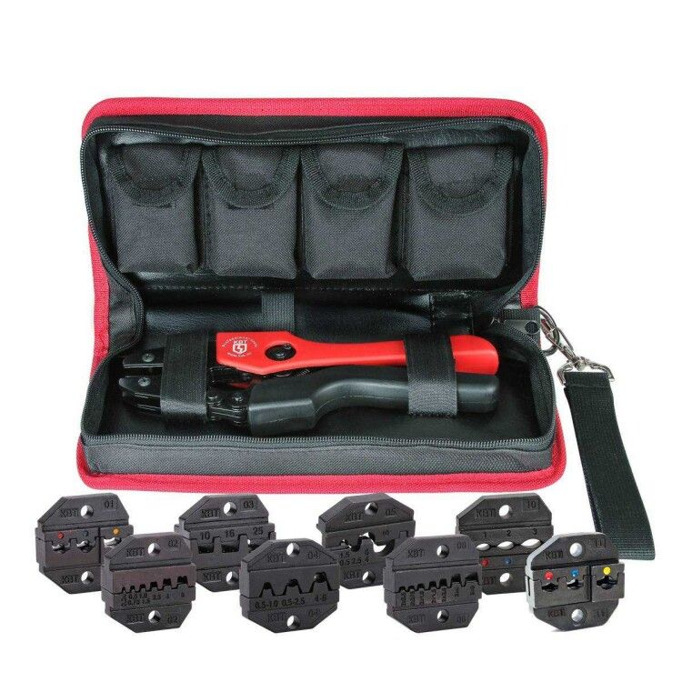 Набор инструментов СТК+8 в сумке от КВТ - это готовый комплект пресс-клещей с восемью сменными матрицами для надежной опрессовки наконечников в электромонтажных работах. Инструмент предназначен для профессионального использования, где важна точность, скорость и безопасность соединений.