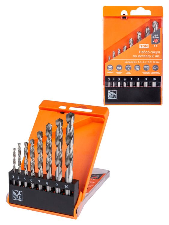 Набор сверл по металлу, 8 шт. (3-4-5-6-7-8-9-10) мм, полир., HSS, ц. хв., пласт. уп., "Рубин" | SQ1093-0101 TDM
