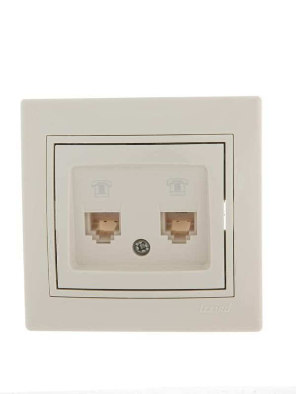 Розетка телефонная двойная RJ11 бежевая/кремовая 16А IP20 евро стандарт со вставкой от Lezard (артикул 701-0303-138, серия MIRA) предназначена для подключения телефонного оборудования и других устройств низковольтной связи в жилых и офисных помещениях, совмещённых с сетью 220 В через встроенную силовую часть.