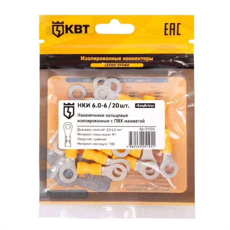 Наконечник кабельный кольцевой изолированный НКИ 6.0–6 (20 шт) с ПВХ изоляцией от бренда КВТ - это готовый комплект для надёжного соединения многопроволочных медных жил с клеммами через винтовые зажимы. Артикул 91004 рассчитан на сечение 6 мм2 и подходит для частых задач в электромонтаже, где важна безопасность и удобство установки.