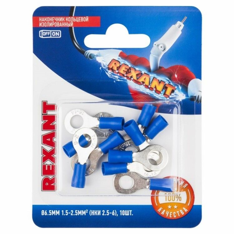 Наконечник кольцевой изолированный ø6.5мм 1.5–2.5мм2 (НКи 2.5-6 / НКи2-6 / RV2-6) синий от Rexant - это готовый соединительный элемент для многожильных медных проводов, обеспечивающий надёжную и долговечную фиксацию в винтовых зажимах. Артикулы 06-0420-a и etm06-0420-a подходят для частых подключений и условий повышенной влажности.
