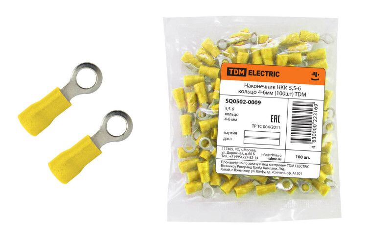 Наконечник НКИ 5,5-6 кольцо 4-6 мм (100 шт) от TDM ELECTRIC - это изолированный медный контакт для надёжного соединения проводов с винтовыми зажимами. Подходит для однопроволочных и многожильных проводников, используется в панелях управления, силовых щитах и оборудовании, подвергающемся вибрации.